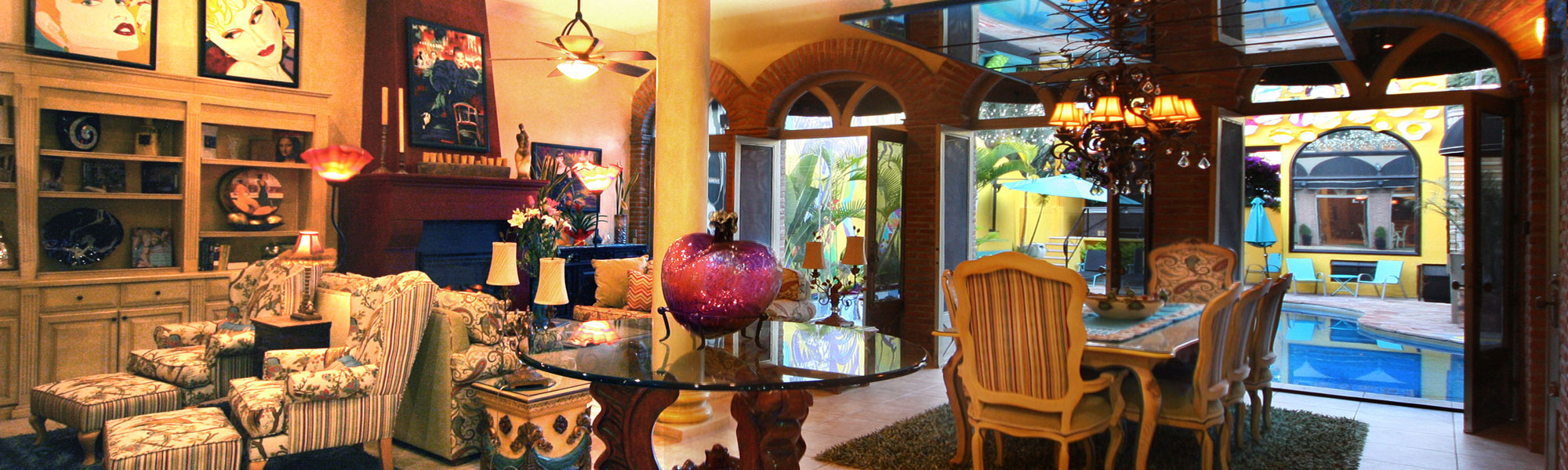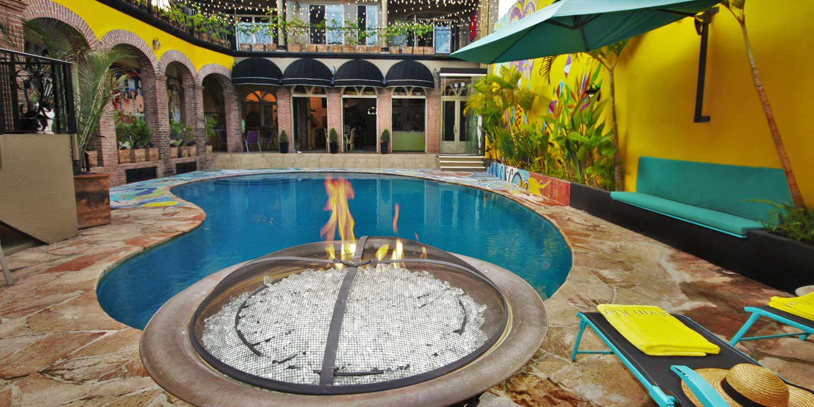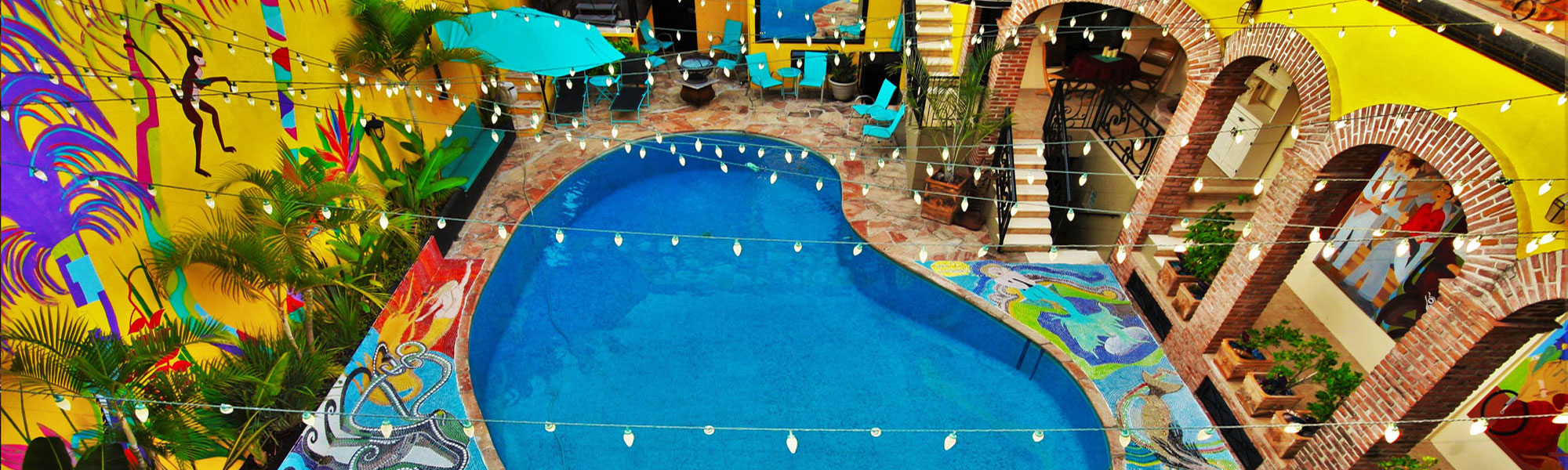 Bellissimo’s both delights and entertains at every turn through its dual atmosphere. Upon entering, the interior decor is peaceful, elegant and exquisite. You feel drawn to the comfortable, overstuffed furniture and inviting mood. But once you pass through the hotel and step outside, it is packed with bright sunshine and colorful walls with delightfully Mexican murals. An intricate, one-of-kind, hand-cut and hand-set mermaid tile mosaic surrounds three quarters of the poolside surface. In addition to the grand, solar-heated pool, you find plenty of lounges, a Hydro-spa, and a copper fire-pit to complete the fun and relaxing ambiance. New conversation area adorned with upholstered loveseat and side chairs with a removable canopy for poolside coffee or cocktails, as well as new covered walkway seating.